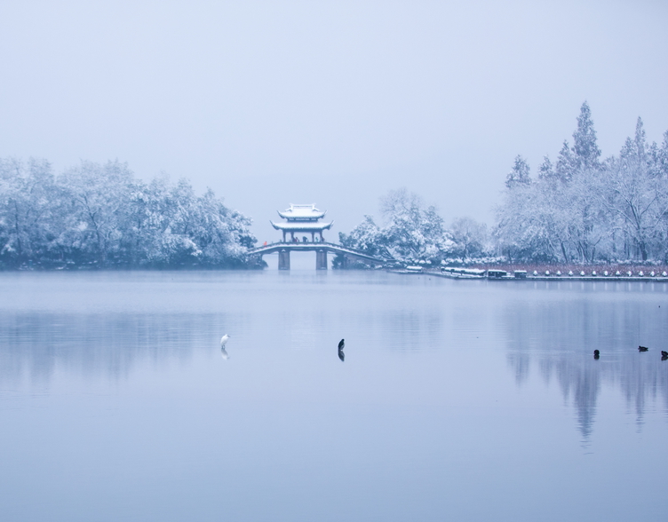 Delicate snowflakes fall lightly on bridges and the lake surface.